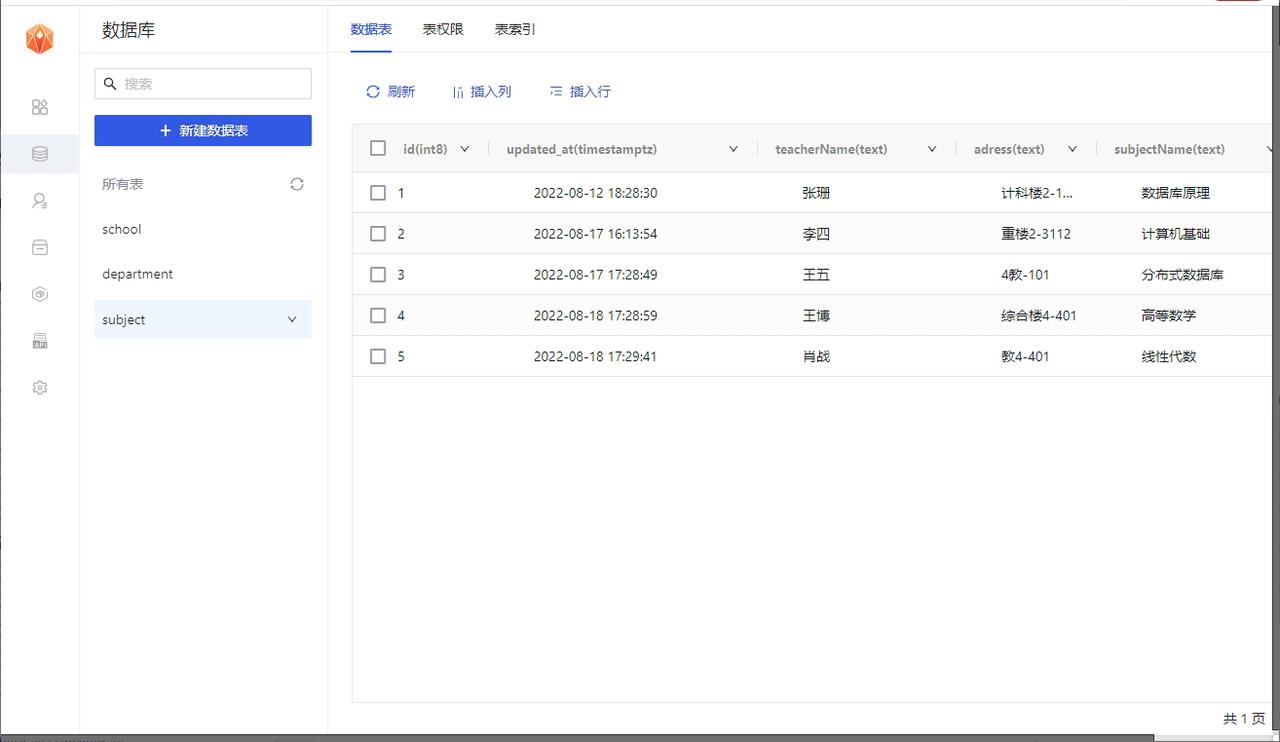 INSERT INTO "public"."subject" ("id", "teacherName", "updated_at", "adress", "subjectName") VALUES ('1', '张珊', '2022-08-12 18:28:30.725+08', '计科楼2-1003', '数据库原理');